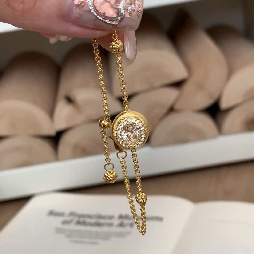 Smooth curves meet subtle sparkle in the Ova Luxe Bracelet . Crafted with a hand-brushed, egg-shaped charm atop an electroplated gold-or-silver chain, it catches the light with every movement. Lightweight, adjustable, and irresistibly modern—wear it alone for a sleek statement or layer it with your favorite pieces.